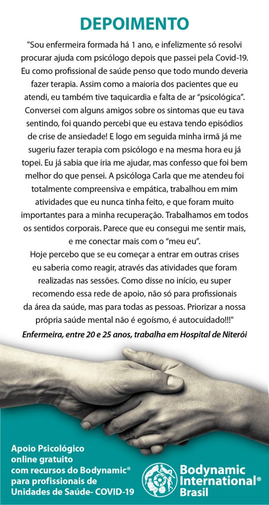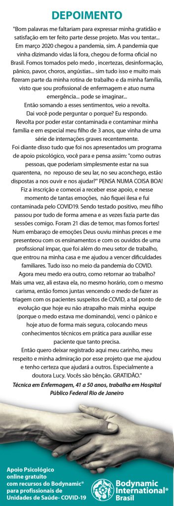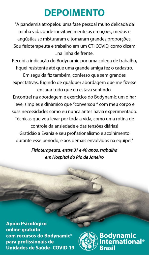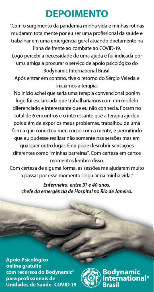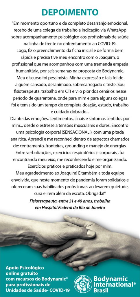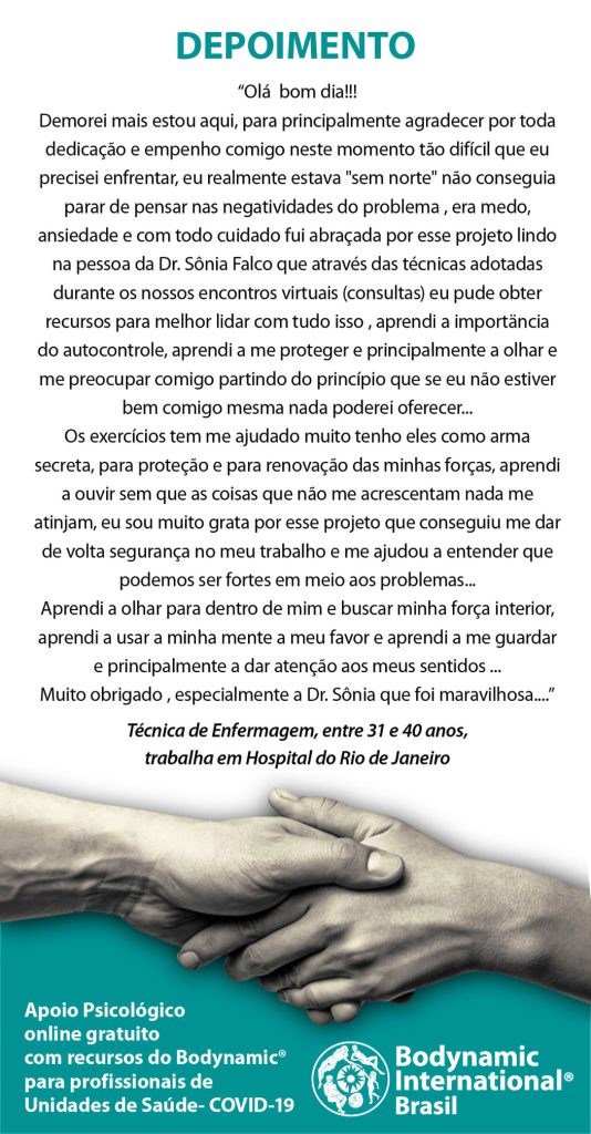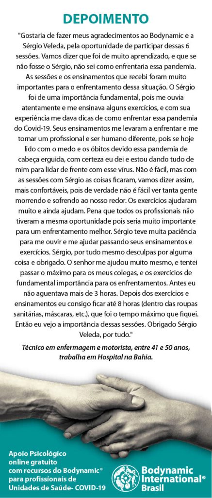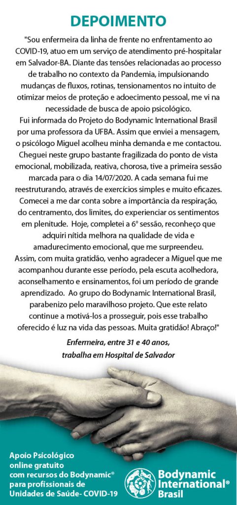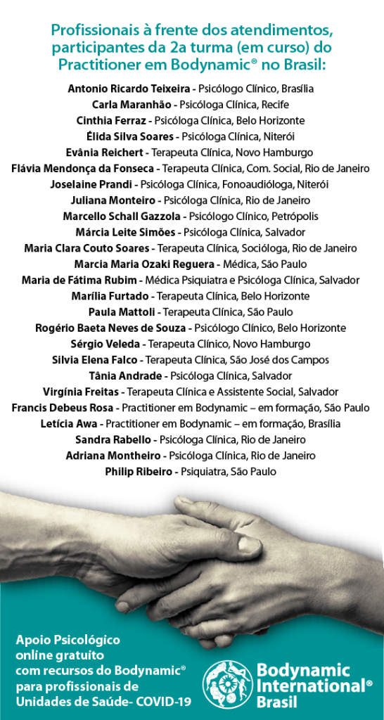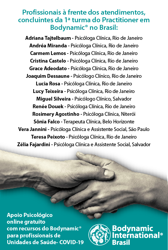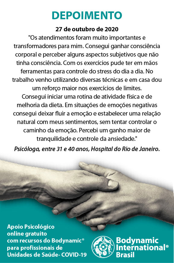 várias técnicas da psicoterapia Bodynamic®, buscando promover suporte emocional, ampliar e fortalecer os recursos psicológicos de todas e todos aqueles à frente da batalha contra a COVID-19! Parabéns a todas e todos nós!