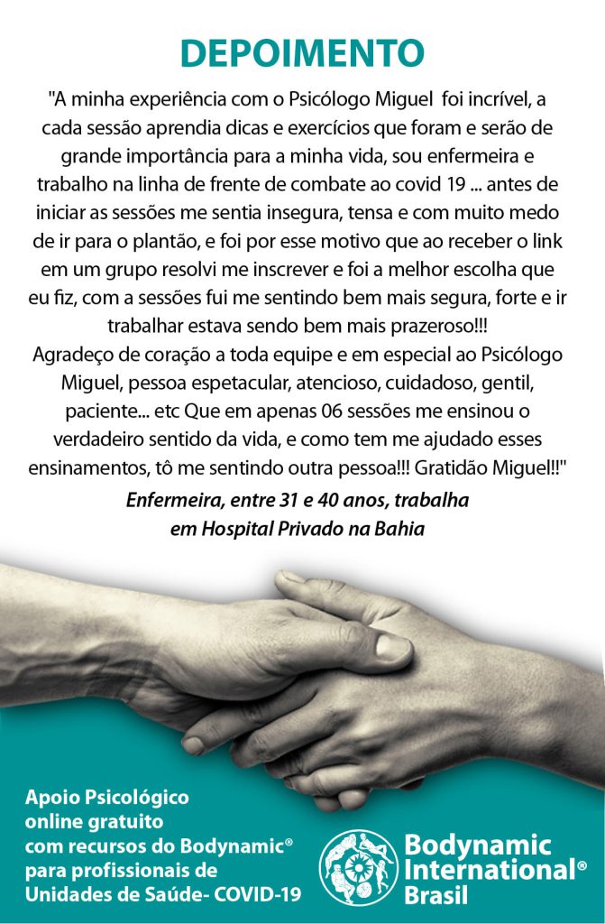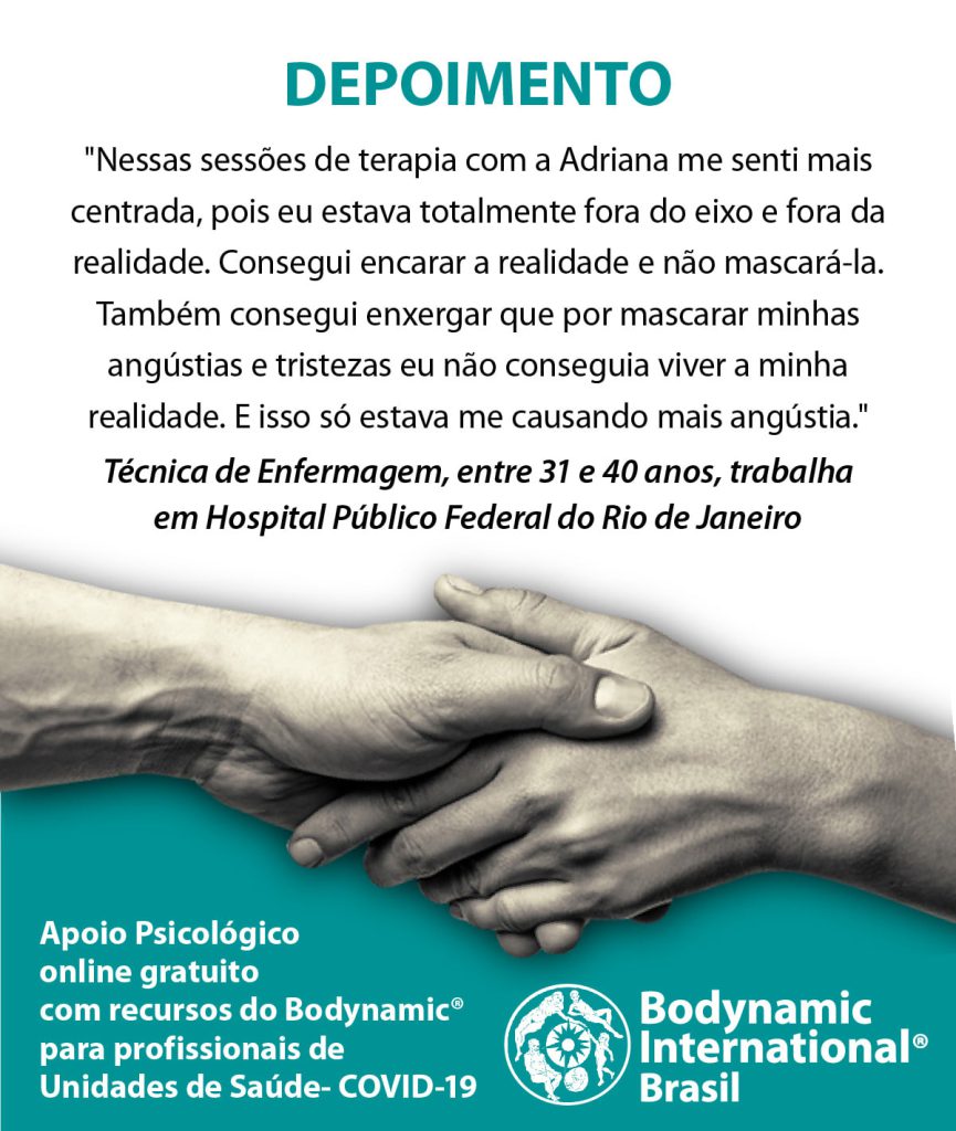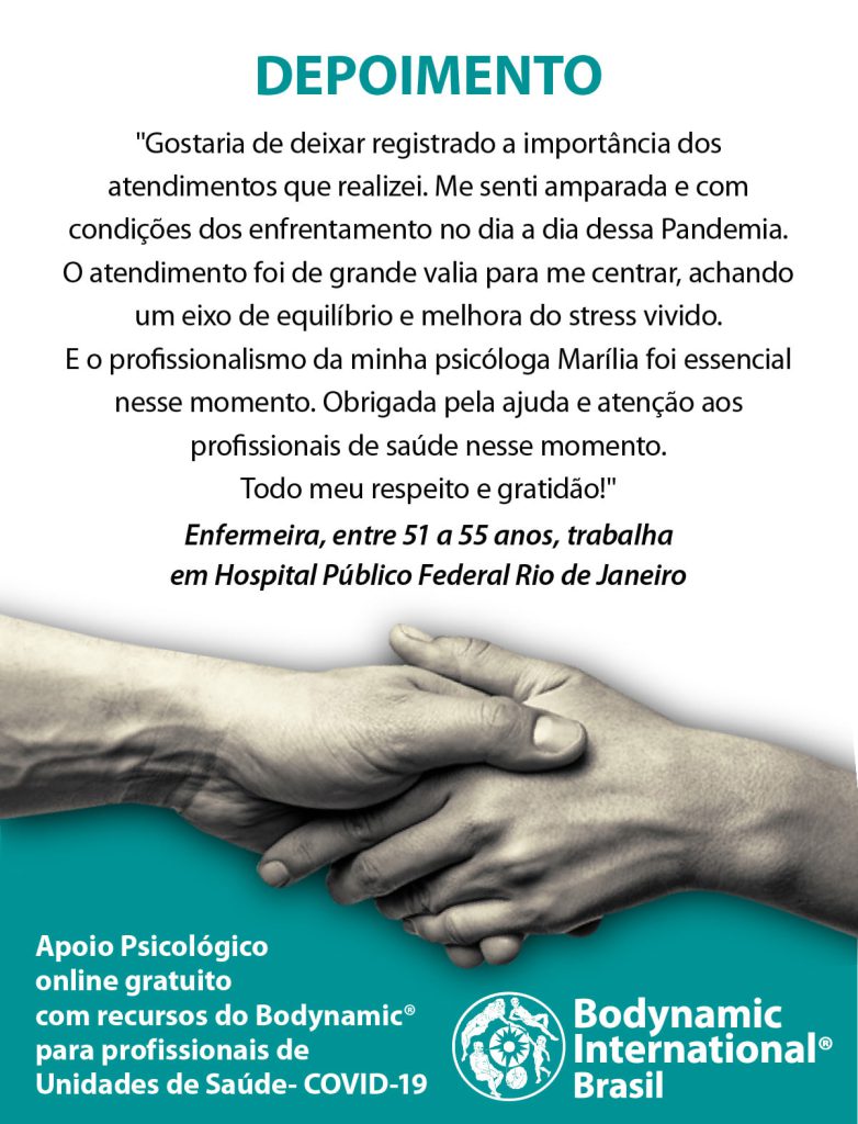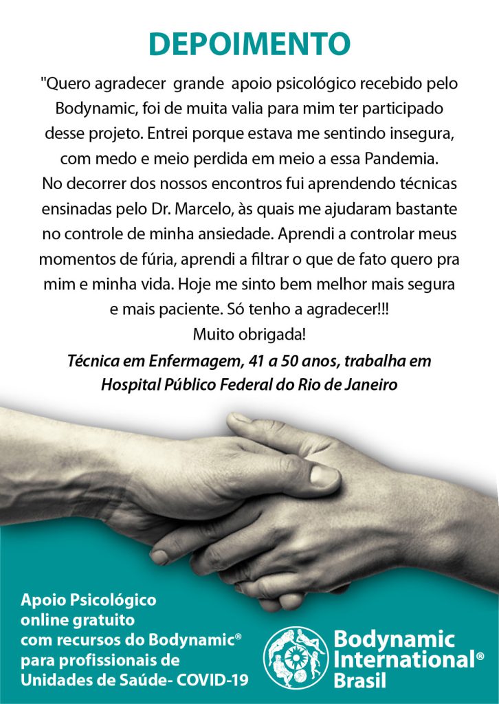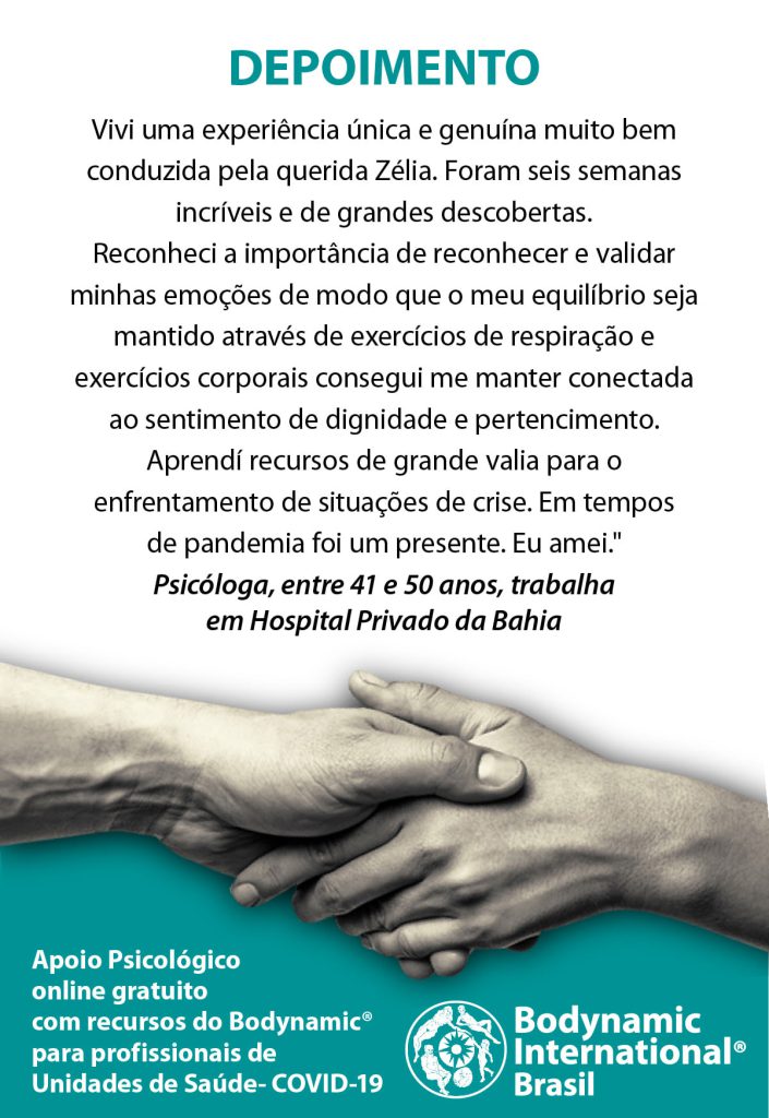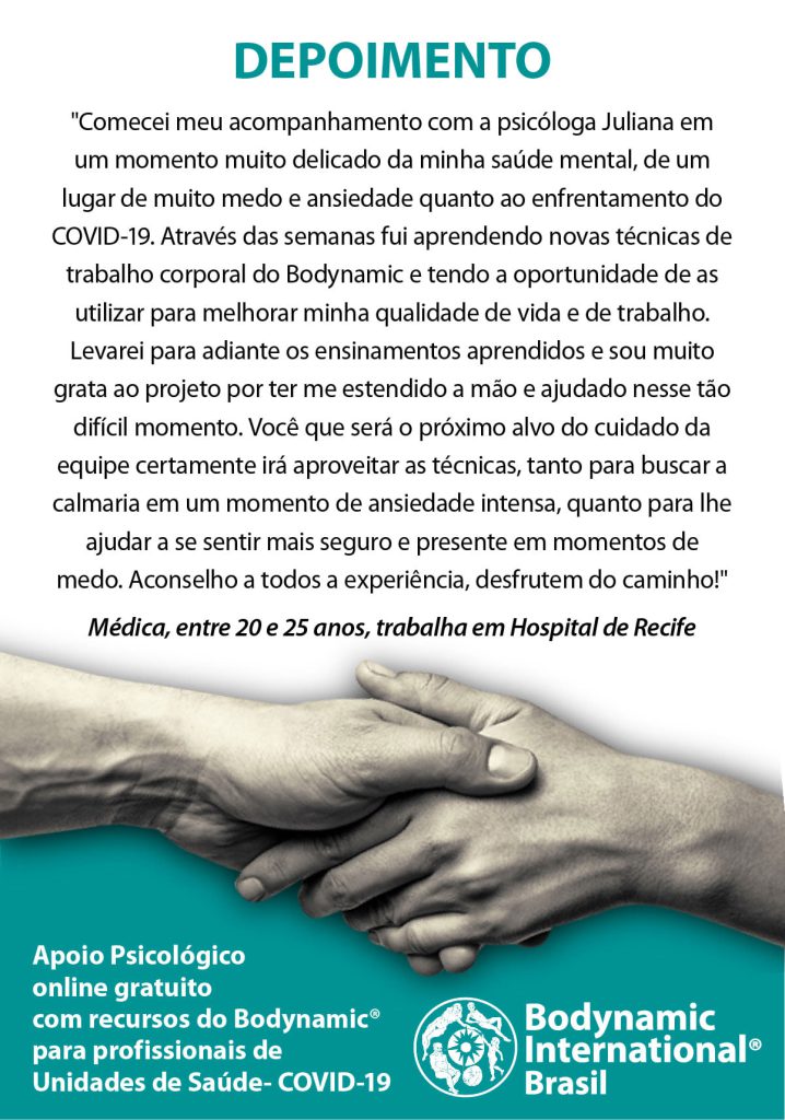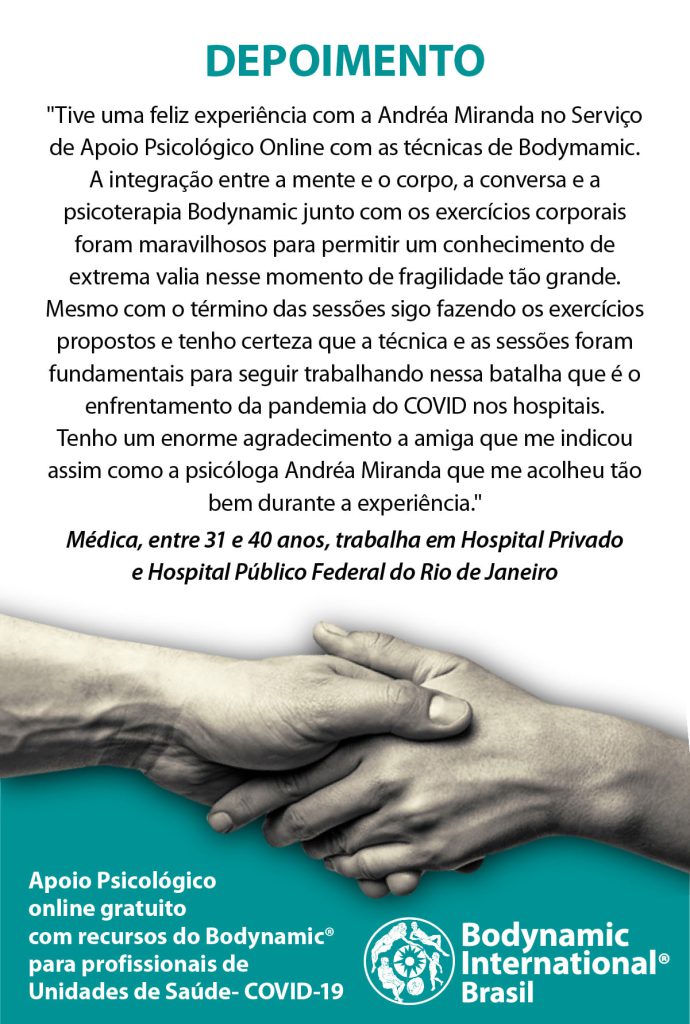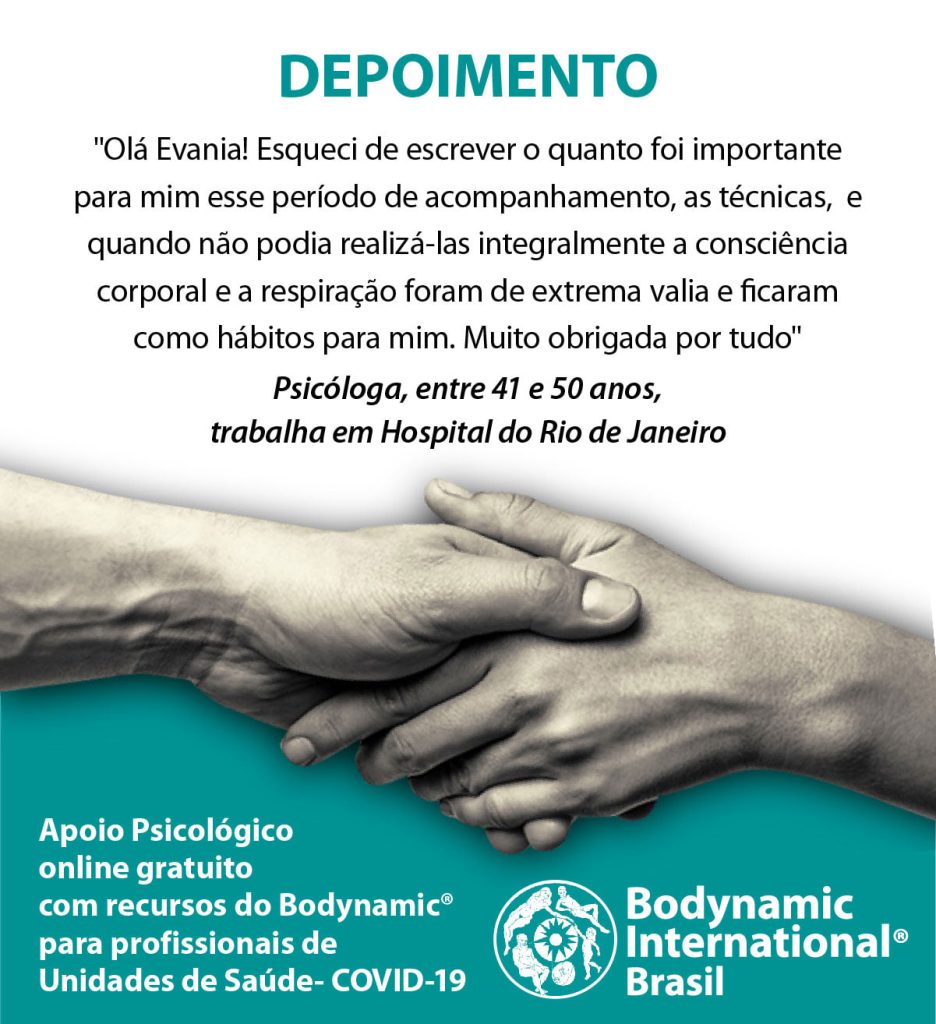 várias técnicas da psicoterapia Bodynamic®, buscando promover suporte emocional, ampliar e fortalecer os recursos psicológicos de todas e todos aqueles à frente da batalha contra a COVID-19! Parabéns a todas e todos nós!